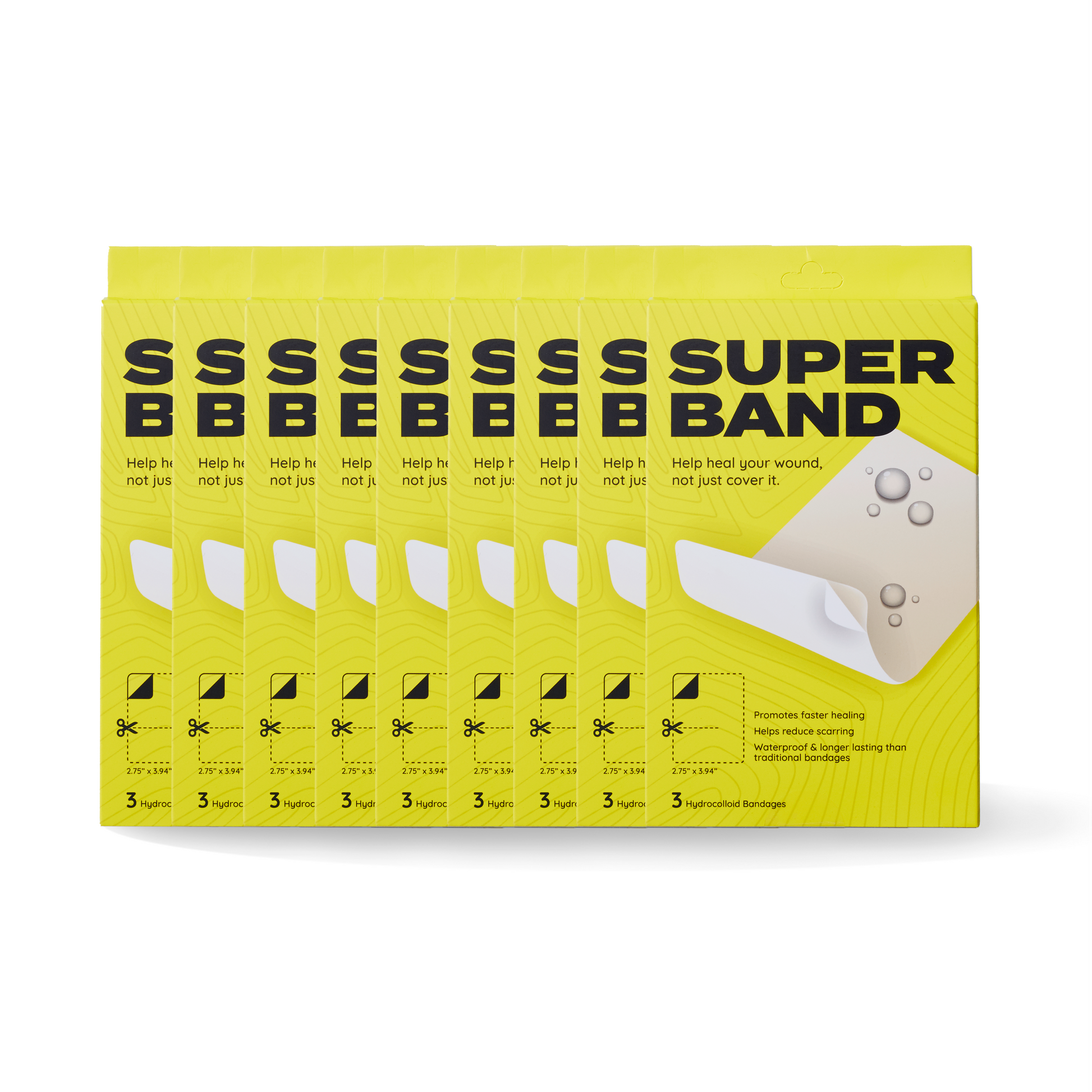 Stock up and save. This case includes 9 boxes of SUPERBANDS, our best-selling hydrocolloid bandage for healing cuts, scrapes, burns, blemishes, eczema, and post-procedure skin with less scarring and faster recovery.